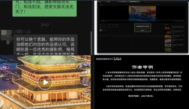 摄影师电饭锅影像表示,其作品一贯标注“未经允许禁止盗用”,然而西安文旅仍擅自将其影像素材用于官方宣传视频,并在微信视频号发布。事后,摄影师多次尝试通过私信联系西安文旅账号与西安摄影协会维权,均未获得有效回应。
