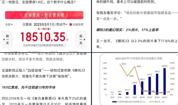 北京朝阳区某影院经理老张望着空荡荡的大厅苦笑道:“现在让《哪吒2》下线,全国至少30%的影院下个月就得裁员关门。”这部续作撑起了整个五一档,更像是一针麻醉剂,暂时掩盖了中国电影产业面临的产能枯竭、人才断层、资本外逃等深层危机。