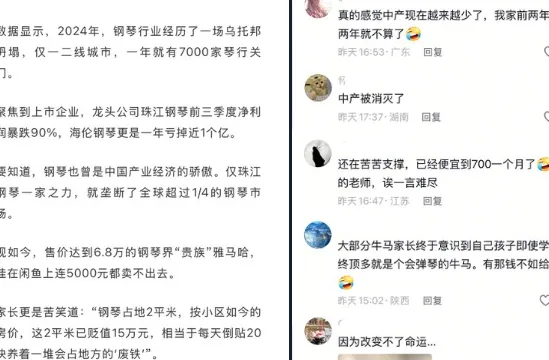 有网友直言,这场崩塌源于中产群体手头紧张,“中产没钱了,哪还有余力供孩子学琴?”一位拥有15年教龄的钢琴老师也无奈表示:“学费已经降到700元一个月了,但琴行和老师们依然在苦苦支撑。”