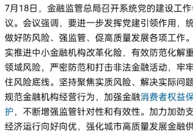 唐人日报7月22日讯:国家金融监督管理总局召开会议,重申必须扎实推进中小金融机构改革和风险化解,强调要“有效防范化解重点领域风险”,释放出监管层对金融系统稳定的高度警惕。