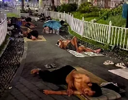 唐人日报10月13日讯:深圳龙华汽车站外,夜色昏黄,地上散落着被子、塑料袋和喝完的饮料瓶。十几名无家可归的男子靠着墙蜷缩而眠,有人裹着破旧的外套,有人靠着背包支撑身体。人群中传来轻微的鼾声,夹杂着公交驶过的低鸣。这些人,正是外界口中的“三和大神”。