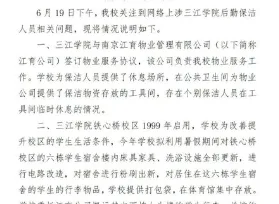 唐人日报6月20日讯:南京三江学院就“保洁阿姨厕所隔间住宿”事件发布情况说明,称相关隔间为“学校应物业公司要求,为保洁人员提供的临时休息场所”,并否认存在保洁人员独自帮学生搬运行李的情况。然而,这一回应未能平息舆论。