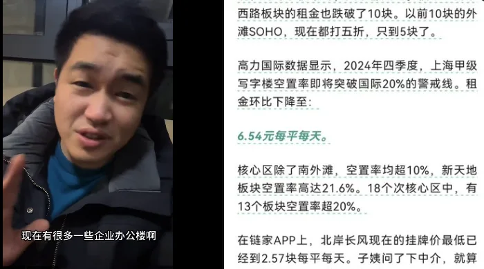 高力国际数据显示,2024年四季度上海甲级写字楼空置率接近20%,租金环比下降至6.54元每平米每天。南外滩、新天地等核心区域空置率均超10%,其中新天地板块空置率高达21%。