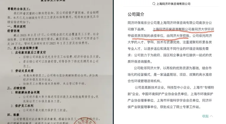 唐人日报2月23日讯:近日,网曝上海同济环保咨询有限公司因资金链断裂,无法支付员工工资和社保费用。公司账户可用资金不足20万元,表示将在后续回款后优先支付社保、经济补偿金及欠薪。
