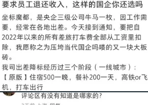 唐人日报5月29日讯:上海一名网友发帖称,其所在央企三级子公司突然要求员工退还自2022年以来所有差旅打车费用,并将这部分费用从工资中逐月扣除。该网友自嘲为“牛马一枚”,愤怒表示:“这无疑是压垮当代国企打工人的又一块大板砖。”
