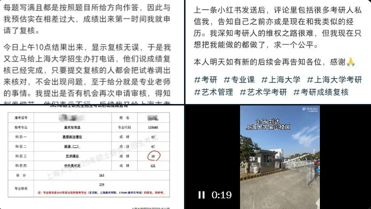由于分数差异过大,该学生对此结果感到难以置信,并在第一时间向上海大学申请了成绩复核。然而,校方复核后回应称,复核结果显示成绩无误。不甘心的学生于昨天从武汉赶往上海,今天亲自前往上海大学寻求更进一步的解释和帮助。