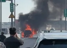从网传画面可见,事发时车辆停靠在高架中央车道,车头位置首先冒出白烟,随后火焰瞬间蹿升数米高,吞噬整个车身。现场火势猛烈,黑烟翻腾直冲天际,夹杂着汽车爆燃的声响。多名目击者在视频中惊呼“车子炸了”,并纷纷减速避让。