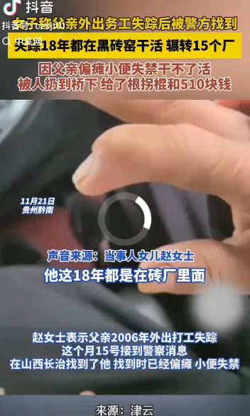 唐人日报11月27日讯:一女子在山西找到失踪18年的父亲。据悉,其父失踪期间被逼在黑砖窑辗转15个厂打工,不干活即遭殴打。因脑梗偏瘫无法继续工作,黑砖窑将其遗弃在长治一桥下,仅给510元和一根拐棍。据其父称,黑砖窑内至少还有31人被强迫劳动,可能均来自贵州。事件曝光后,引发社会对非法强迫劳动和黑砖窑问题的高度关注。