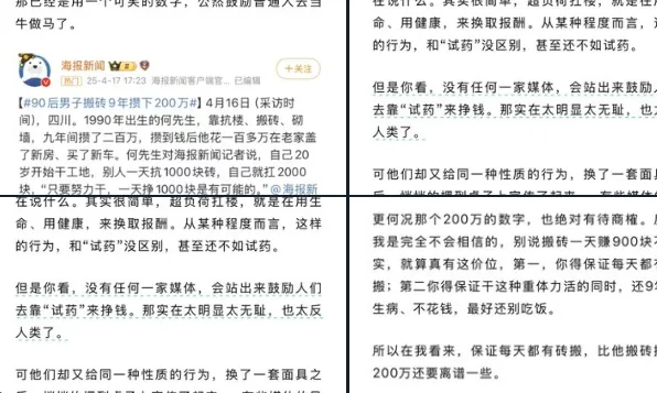 唐人日报4月23日讯:近日,一则“90后男子搬砖9年攒下200万元买房买车”的“正能量新闻”引发广泛讨论。而博主“竹不倒”对此提出尖锐批评,直指这是“在公然鼓励普通人去当牛做马”。