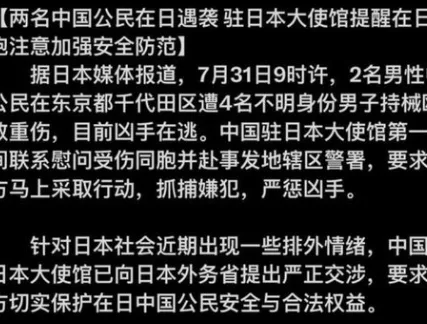 东京街头突发袭击!两名中国公民遭4人持械围殴,使馆紧急发声