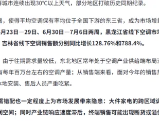 据权威数据显示,黑龙江省在6月23日至29日这一周,线下空调销售额同比飙涨817.68%;6月30日至7月6日,再次同比增长438%。吉林省表现同样强劲,空调销售额在上述两周内分别同比增长128.76%和788.4%。多个城市家电卖场频现“空调断货”“排队安装”等现象,部分热销型号甚至“一机难求”。