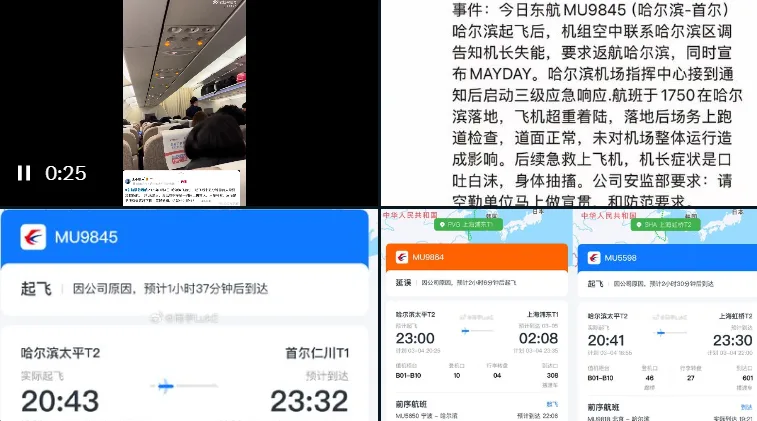 唐人日报3月5日讯:近日,中国东方航空公司执飞的MU9845航班(哈尔滨至首尔)在起飞不久后突发紧急情况,不得不决定返航哈尔滨。据未经证实的网络消息称,起飞后飞机机长突然身体不适,出现严重症状,基地紧急指示返航并宣布MAYDAY紧急状态。一名乘客描述称,飞机起飞约15分钟后,就有紧急医疗情况发生,机长疑似严重病发。