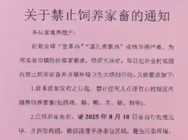 唐人日报8月11日讯:广东省东莞市一村庄的公告引发舆论热议。网友拍摄的图片显示,为防控“肯孔基雅热”和登革热,该村要求辖区内住户全面禁止饲养家畜,并对已饲养的居民限期在8月18日前自行处理完毕。
