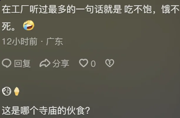 评论区瞬间沦陷,有人调侃称:“这是哪个寺庙的伙食?”也有人直言,“工厂最多的就是吃不饱,饿不死”。不少网友表示,工人高强度劳动却得不到最基本的营养补给,实属不合理。
