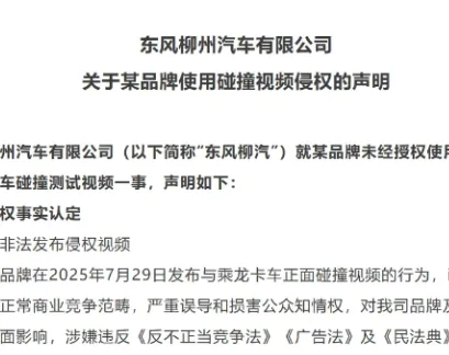 唐人日报8月4日讯:东风柳州汽车有限公司(以下简称“东风柳汽”)公开发表声明,强烈谴责某汽车品牌于7月29日发布的一段与乘龙卡车正面碰撞的宣传视频,称其行为已构成严重侵权,并对品牌形象造成恶劣影响。