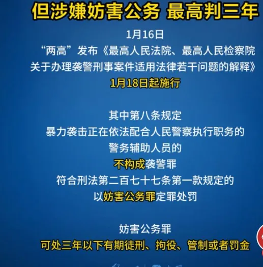 唐人日报1月19日讯:近日,最高法院与最高检察院发布了《关于办理袭警刑事案件适用法律若干问题的解释》。该解释第八条明确规定,袭击辅警不再构成袭警罪,但可能涉嫌妨害公务罪,最高刑期可判三年。