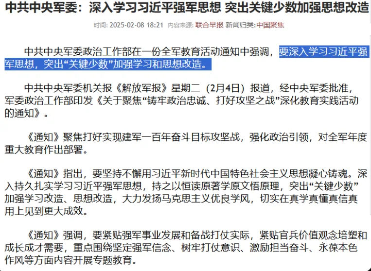 唐人日报2月9日讯:近日,中共中央军委政治工作部发布全军教育活动通知,强调要深入学习习近平强军思想,并突出“关键少数”在学习和思想改造方面的重点。