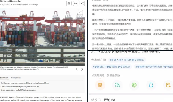 更令人关注的是,路透社还指出,中国已拟定一份“白名单”,列出可豁免高关税的美国产品,并已低调通知部分相关企业执行。但名单中具体涵盖哪些商品,目前仍属未知。