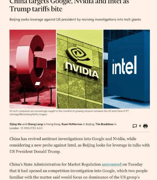 唐人日报2月5日讯:近日,中国国家市场监督管理总局宣布对Google展开反垄断调查,重点关注其Android操作系统的市场主导地位及对中国手机制造商如OPPO、小米造成的影响。据知情人士透露,中国监管机构去年12月已对英伟达展开类似调查,目前也在考虑对英特尔进行正式调查,但调查是否启动可能受中美关系的影响。