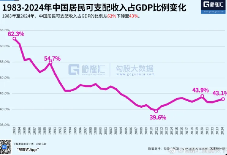 唐人日报2月8日讯:近日,根据格隆汇数据,1983年至2024年,中国居民可支配收入占国内生产总值(GDP)的比例显著下降,从62%降至43%。这一变化反映了中国经济结构的变化,特别是制造业、房地产和资本市场等行业的快速发展,这些行业的增长未能带动居民收入的同步增长。专家指出,收入分配不均和资本收益的增加是导致这一趋势的主要因素。