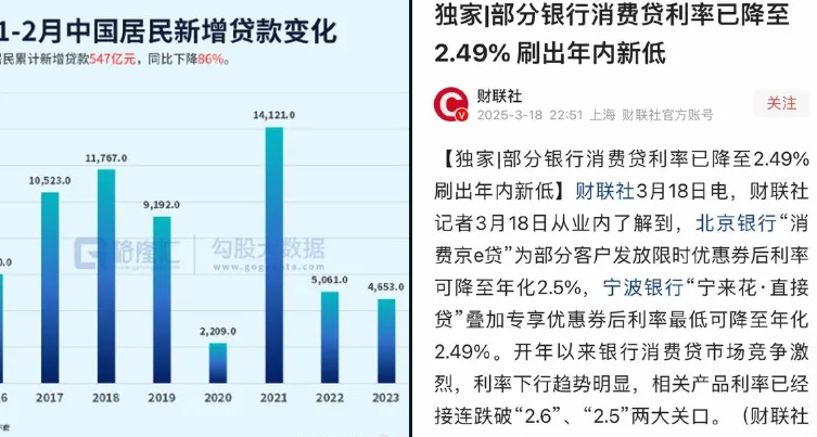 唐人日报3月20日讯:近日,中国居民贷款市场出现显著变化。据格隆汇报道,2025年1月至2月,中国居民累计新增贷款额为547亿元,同比大幅下降86%。这一变化标志着居民贷款增速放缓,反映出当前经济环境中居民借贷意愿的减弱。