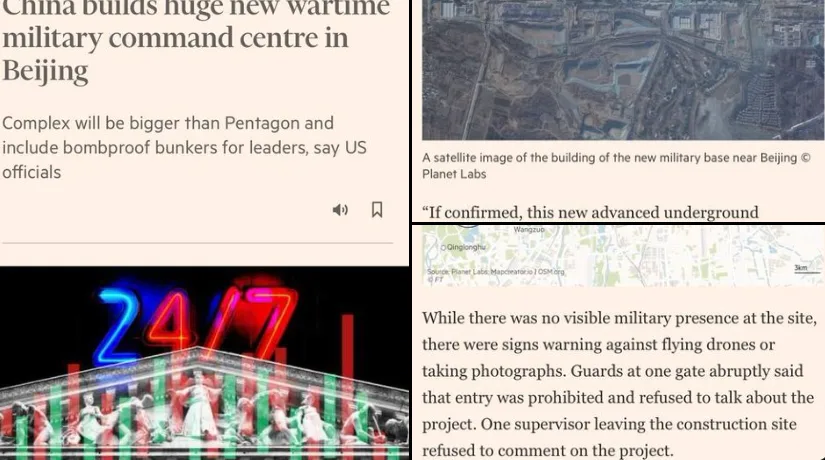唐人日报1月31日讯:近日,中国正在北京郊区建设全球最大的军事指挥中心,规模预计超过五角大楼。美国情报部门认为该建筑群将作为战时指挥中心,卫星图像显示,位于北京西南约30公里的建筑工地占地约1500亩,且存在多个深坑,预计用于建造大型胶原掩体,以保护中国领导人应对任何冲突,特别是核战争。