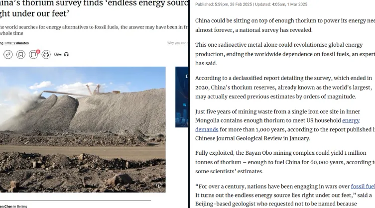 唐人日报3月6日讯:近日,中国在内蒙古白云鄂博矿区新近探明一座储量超过百万吨的超级钍矿,这一发现可能对全球能源格局产生重大影响。据悉,这一钍矿的储量足以保障中国未来6万年的能源需求,具有划时代的意义。