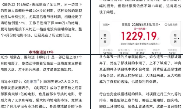 唐人日报5月6日讯:据公众号“犀牛娱乐”统计,截至目前,2025年4月中国电影总票房仅刚刚突破11亿元,创下13年来最低,市场规模已退回至2012年水平。这一数字甚至低于口罩前后的表现,更比2017年巅峰期暴跌74%。