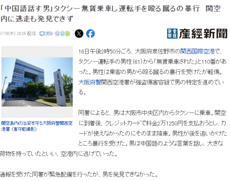 唐人日报1月19日讯:近日,一名中国男子在大阪市内搭乘出租车前往关西机场,欲用信用卡支付2万日元车费,但支付未成功。男子随后下车逃离,出租车司机追赶并遭到男子殴打。男子随后快速进入机场,并搭乘航班逃离日本。