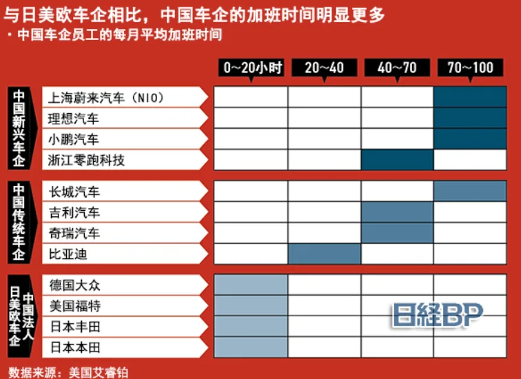 相比之下,传统汽车制造巨头如德国大众和日本丰田在中国的法人加班时间则控制在0至20小时范围内,显示出中外企业在员工工作文化上的显著差异。研究结果进一步揭示了中国本土车企比亚迪和吉利汽车的员工加班时间分别为20至40小时和40至70小时,反映出国内汽车行业普遍存在的加班问题。