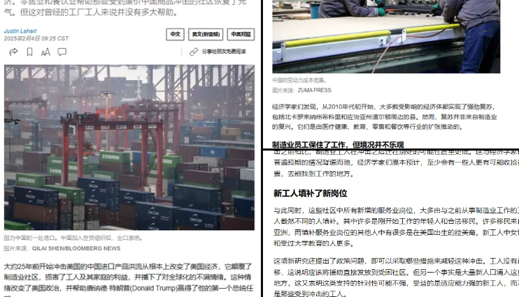 唐人日报2月5日讯:近日,《华尔街日报》报道称,约25年前开始的大规模中国商品进口对美国经济产生了深远影响,尤其改变了制造业社区,削弱了工人阶层的利益,并加剧了对全球化的反感。研究显示,尽管零售和餐饮业在某些受到中国廉价商品冲击的社区恢复了经济活力,但这一变化对工厂工人并未带来实质性帮助。