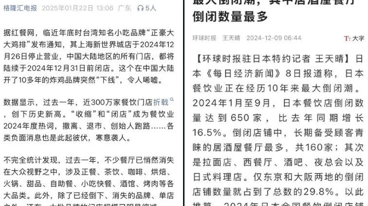 与此同时,环球时报援引日媒消息称,日本餐饮业也在经历十年来最大的倒闭潮,2023年1-9月,餐饮店倒闭数量达到650家。中日两国餐饮行业的困境反映了全球经济压力对餐饮行业的巨大冲击,尤其是在消费需求下降和运营成本增加的背景下,行业复苏面临巨大挑战。