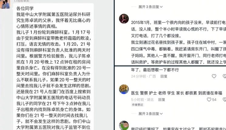 唐人日报1月26日讯:近日,网曝中山大学第五医院泌尿外科研究生陈卓凯因不堪忍受麻醉科带教老师的霸凌与打压,在出租屋内自杀身亡。陈卓凯的父亲表示,孩子去世后,医院竟整整一天都未与家属联系,这一处理方式令他深感不解与愤怒。