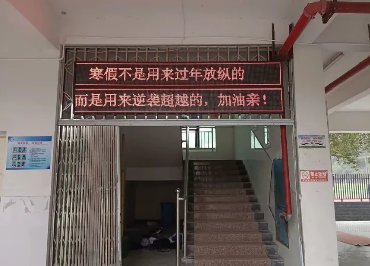 唐人日报2月2日讯:近日,一所中学的电子屏幕上发布了一条引发关注的标语:“寒假不是用来过年放纵的,而是用来逆袭超越的,加油亲。”该标语引起了部分家长和学生的讨论。许多人认为,这样的宣传语可能给学生带来过大的压力,尤其是在节日期间本应放松的寒假时光。