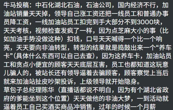 更令人愤怒的是,公司近年来大力推行所谓“非油转型”,成果之一是强制推销“养车卡”。据员工反映,该卡套路深、权益虚高,被内部员工普遍认为是“骗人的产品”。然而,公司却要求员工对顾客极力推销,甚至采用误导手段。顾客一旦察觉被骗,便前往加油站投诉、争吵,苦果全部由一线员工承担。