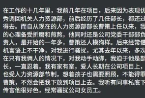唐人日报9月1日讯:近日,一则实名控诉引发关注。一名自称是中铁一局第五工程公司女职工的人在投稿中称,自己在陕西宝鸡工作期间,长期遭到公司人力资源部负责人曹策的骚扰和侵害。她表示,因拒绝对方的不当要求,反而遭遇打击报复,被停发工资、停职处理,身心备受摧残。