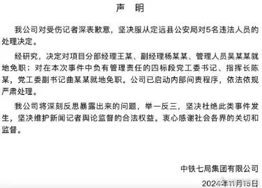 唐人日报11月16日讯:近日,中铁七局就记者受伤事件发布声明,向受伤记者致歉并服从公安处罚决定。公司决定对项目分部经理王某等5人就地免职,并启动内部问责程序,依法严肃处理。声明承诺杜绝类似事件,维护记者舆论监督权利。