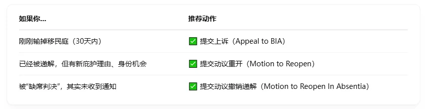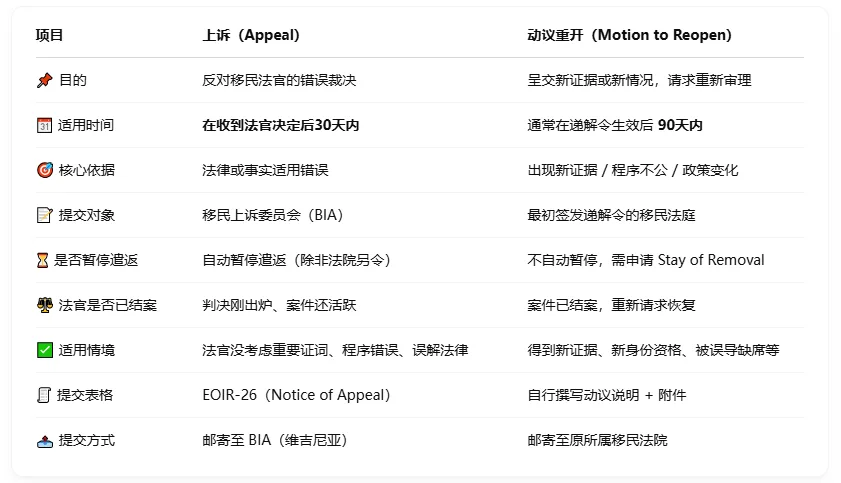 这是一个非常关键的问题,理解上诉(Appeal)与动议重开(Motion to Reopen)之间的区别,有助于你在面对递解令(Order of Removal)时采取正确的法律行动。