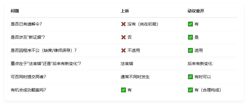 总结对比:上诉 vs 动议重开