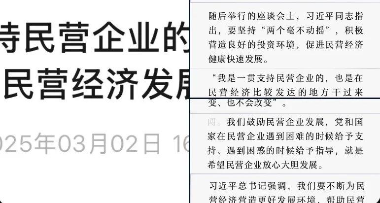 文章中引用了习近平多次公开演讲和内部会议中的言论,强调民营企业在推动经济发展、增加就业、促进创新和社会稳定中的关键作用。习近平指出,民营经济不仅是中国经济的重要组成部分,也是社会主义市场经济的重要基础。他强调,要营造公平竞争的市场环境,保护企业家合法权益,激发民营企业活力和创造力。