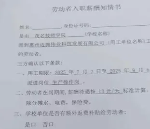 唐人日报9月2日讯:近日,一份名为《劳动者入职薪酬知情书》的文件在网络上曝光,再次将学生实习乱象推上风口浪尖。文件显示,云南某技师学院学生被派往昆明一家企业实习,工资标准竟仅为13元/天,且需自行承担餐饮、水电及保险等费用。换言之,这些实习生每天辛苦劳动后,所得甚至不足以覆盖最基本的生活开支。