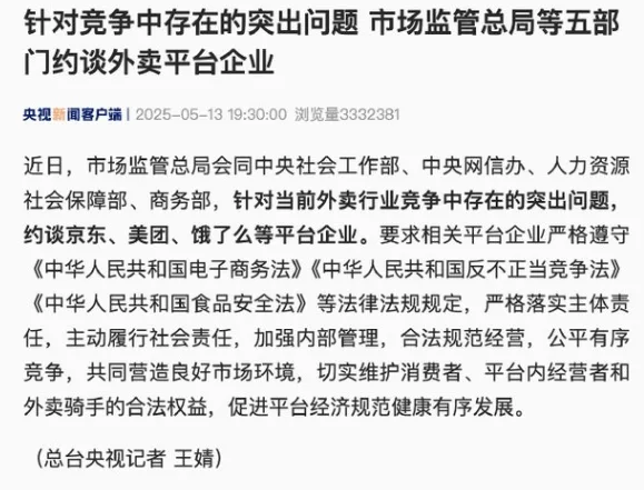 五部门联合约谈外卖巨头!京东、美团、饿了么被要求严守电商、食品安全法规
