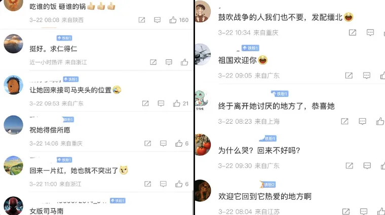 中国网民对于这一事件有不同看法,不少人对“亚亚在台湾”遭遇的处罚表示讽刺和调侃,评论称:“挺好的,求仁得仁。”另一部分网友则认为:“她终于如愿所偿了,离开台湾。”还有一些网民表示:“她终于离开了讨厌的地方,恭喜她。”
