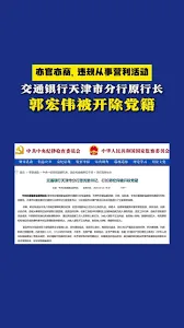 唐人日2月26日讯:近日,交通银行天津市分行原党委书记、行长郭宏伟因涉嫌严重违纪违法,经过立案审查调查后,决定开除其党籍,并移送司法机关处理。