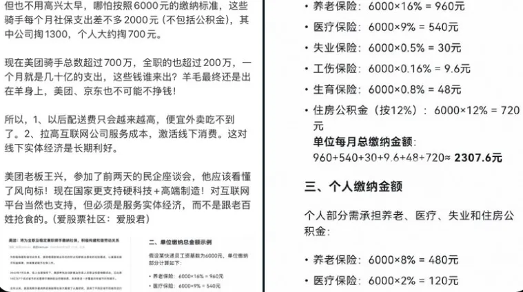唐人日报2月20日讯:近日,京东和美团相继宣布将为骑手缴纳社保。这一举措看似利好骑手,但媒体“爱股票”提醒,虽然公司承担部分费用,但骑手每月的社保支出仍不容忽视。以6千元的缴纳标准为例,每月社保费用约2000元,其中公司负担1300元,骑手需掏700元。美团目前骑手总数已超700万,预计每月支出数十亿元。