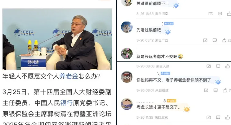 然而,不少年轻网民对此表达了不同看法。有网友表示:“我就是长远考虑,所以才不交的。”这种观点反映了部分年轻人对未来养老金制度可持续性的担忧。还有人说:“眼前都顾不上了,谈不上长远。”这说明当前经济压力和生活成本的增加使得一些年轻人觉得难以承担额外的养老金缴纳。