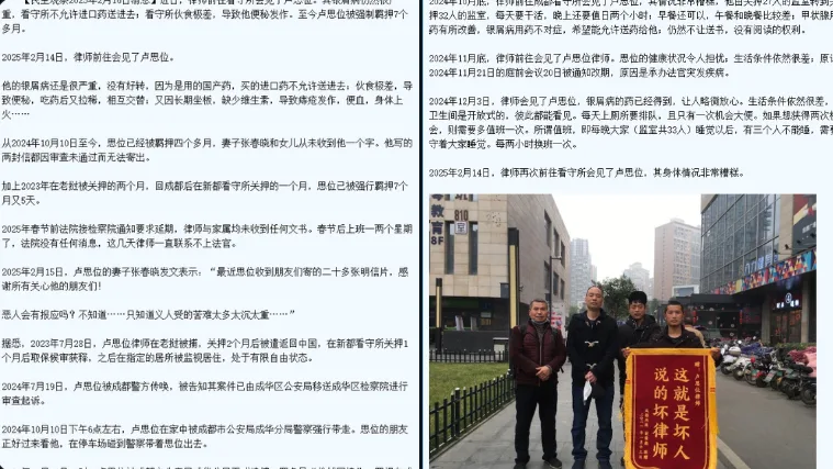 唐人日报2月19日讯:人权律师卢思位近日在看守所获得律师会见,妻子张春晓透露,卢思位的银屑病加重,且因使用国产药物未能有效治疗。其在狱中的伙食极差,导致便秘与腹泻交替,且长期坐板致痔疮发作并伴随便血,身体状况堪忧。