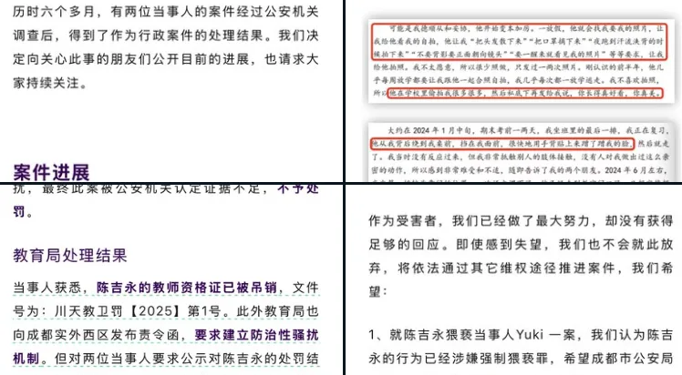 “长夜微光”呼吁警方重新审视这些案件,并追究陈吉永的刑事责任。此外,他们还要求公开陈吉永教师资格被吊销的处罚决定书。