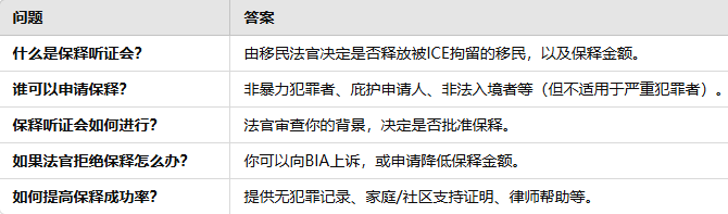 保释听证会(Bond Hearing) 是移民法庭(Immigration Court)的一种程序,用于决定被拘留的移民是否可以被释放,并设定保释金(Bond Amount)。如果成功,移民可以在等待庇护或其他移民案件的审理期间不被关押,回归自由生活。