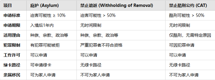- 禁止遣返:适合在原籍国面临迫害风险的人,但无绿卡路径。